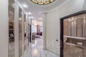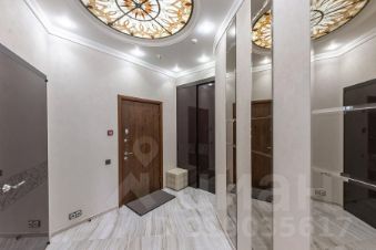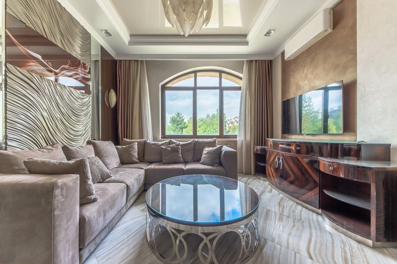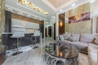 Витражи Tiffany на потолке в коридоре и на кухне с подсветкой ручной работы из натурального венецианского стекла, и итальянская мебель придают изысканность и шарм квартире.