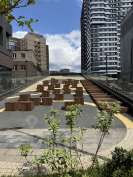 Благоустроенная крыша с шезлонгами, мягкими зонами и панорамными видами на город.