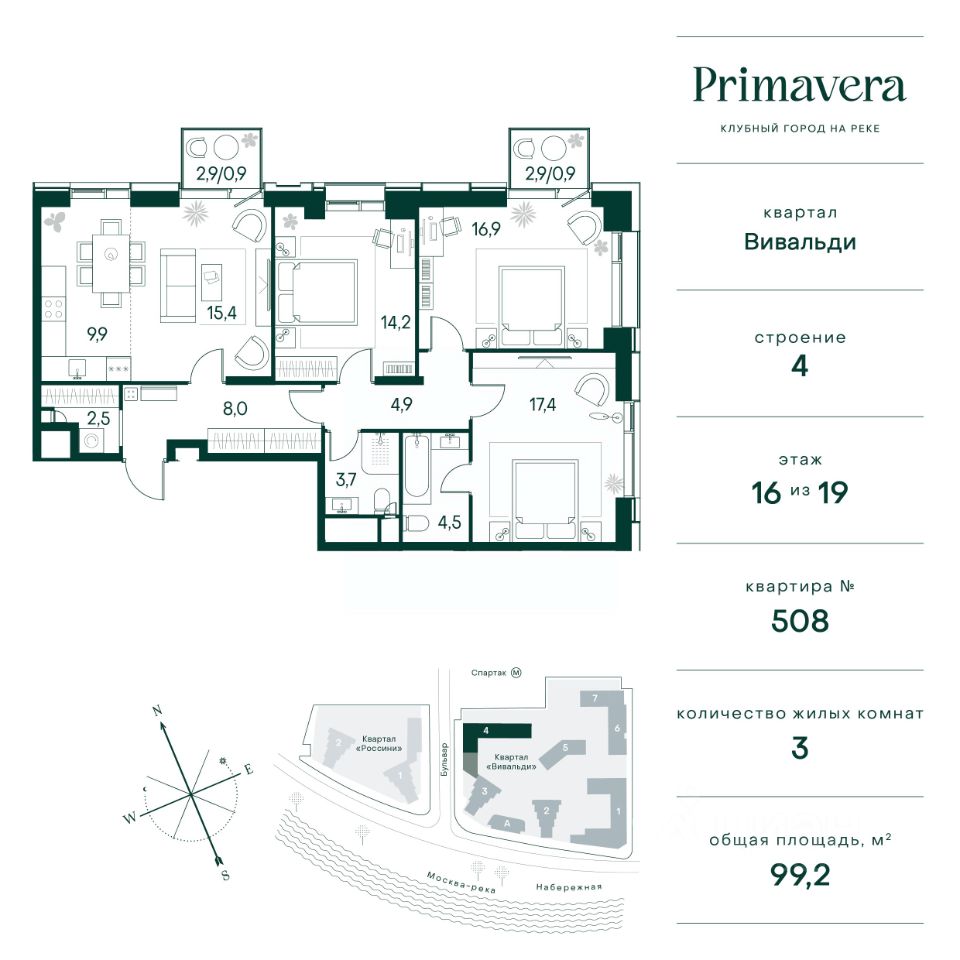 Клубный город на реке Primavera — это современный жилой комплекс премиум-класса, расположенный на первой береговой линии Москвы-реки в экологически чистом районе Покровское-Стрешнево. Под панорамными окнами квартир находится собственный экопарк с продуманной сетью прогулочных дорожек и современными детскими и спортивными площадками. За парком расположена набережная с собственным пляжем и зонами для отдыха. Клубный город на реке Primavera предлагает широкий выбор планировок для различных жизненных сценариев: от просторных однокомнатных квартир до пентхаусов и жилых помещений с террасами и патио. Выберите из 120 вариантов эргономичных планировок стандартного и евроформата. Из каждой квартиры открываются красивые виды на реку с углом обзора в 270 градусов. Дизайнерские лобби предлагают панорамный обзор на благоустроенный двор. Высокие потолки в 6 метров и качественная отделка создают атмосферу, схожую с пятизвездочными отелями. В Primavera есть всё необходимое для комфортной жизни в мегаполисе: • Образование для детей в шаговой доступности: 4 школы, 8 детских садов и развивающие центры с кружками и секциями. • Удобства на расстоянии приятной прогулки: супермаркеты, кафе, рестораны с верандами, салоны красоты, аптеки и многофункциональный центр для шоппинга и развлечений. • Умный дом: автоматизированное бесконтактное управление основными системами доступа и безопасности через мобильное приложение. Клубный город на реке Primavera выгодно сочетает комфорт городской жизни с близостью к природе. Живите в месте, где все создано для вашего удобства!