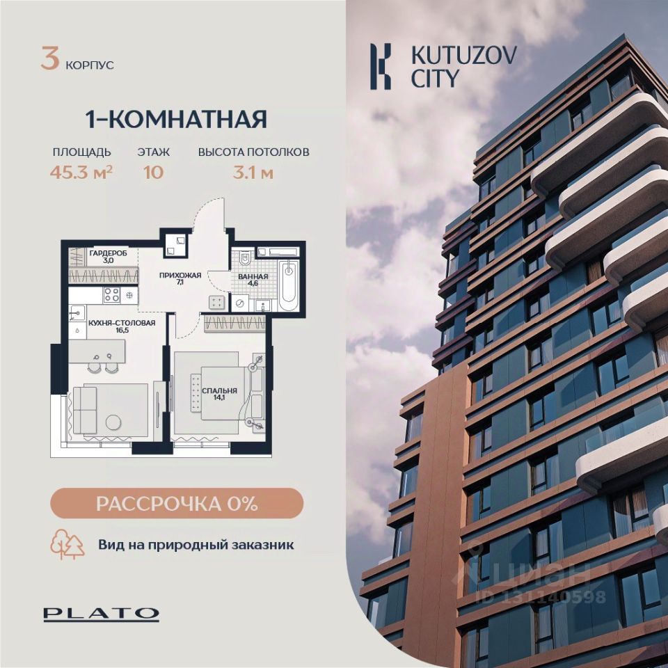 Продаётся светлая однокомнатная квартира евроформата площадью 45,3 м² в башне "Созидание" клубного дома "Кутузов Сити". Планировка квартиры продумана до мелочей и позволяет создать комфортное пространство для жизни. Просторная кухня-столовая с панорамными окнами объединяет обеденную зону, кухню и гостиную. Изолированная спальня обеспечивает уединённое пространство для отдыха. Для хранения вещей предусмотрена отдельная гардеробная. Просторная ванная комната позволяет разместить как душевую кабину, так и большую ванную. Окна наполнят квартиру естественным светом и сделают интерьер стильным. Высокие потолки придают пространству ощущение свободы и лёгкости. Продуманная планировка позволяет эффективно использовать каждый квадратный метр. О проекте: "Кутузов Сити" — клубный дом на 220 квартир, разработанный совместно с бюро Atrium и Oleg Klodt Architecture & Design. Проект строится в престижном Западном административном округе Москвы, всего в нескольких минутах ходьбы от Кутузовского проспекта. Закрытая территория, приватный двор, подземный паркинг и стильные лобби создают атмосферу комфорта и безопасности. В двух шагах от дома находится крупнейшая природная территория Москвы — природный заказник "Долина реки Сетунь". Камерная застройка и развитая инфраструктура делают "Кутузов Сити" отличным выбором для тех, кто ценит качество жизни и близость к природе. (Лот: 136)