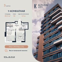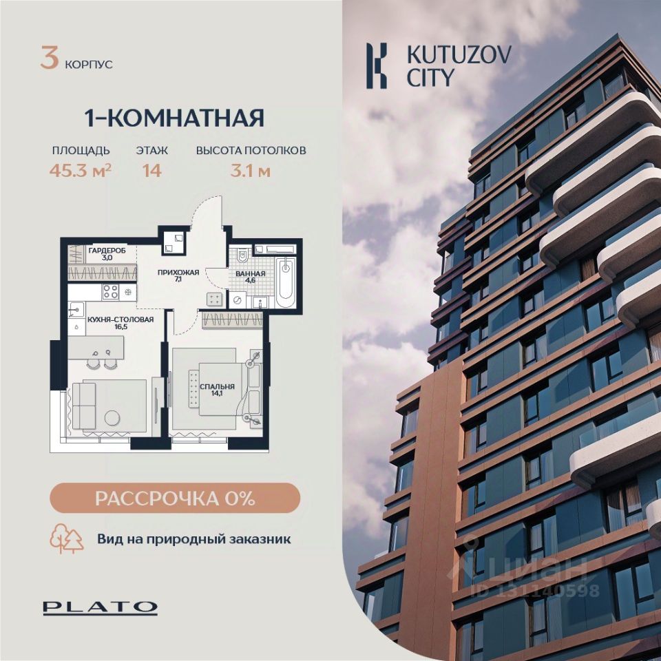 Продаётся светлая однокомнатная квартира евроформата площадью 45,3 м² в башне "Созидание" клубного дома "Кутузов Сити". Планировка квартиры продумана до мелочей и позволяет создать комфортное пространство для жизни. Просторная кухня-столовая с панорамными окнами объединяет обеденную зону, кухню и гостиную. Изолированная спальня обеспечивает уединённое пространство для отдыха. Для хранения вещей предусотрена отдельная гардеробная. Просторная ванная комната позволяет разместить как душевую кабину, так и большую ванную. Окна наполнят квартиру естественным светом и сделают интерьер стильным. Высокие потолки придают пространству ощущение свободы и лёгкости. Продуманная планировка позволяет эффективно использовать каждый квадратный метр. О проекте: "Кутузов Сити" — клубный дом на 220 квартир, разработанный совместно с бюро Atrium и Oleg Klodt Architecture & Design. Проект строится в престижном Западном административном округе Москвы, всего в нескольких минутах ходьбы от Кутузовского проспекта. Закрытая территория, приватный двор, подземный паркинг и стильные лобби создают атмосферу комфорта и безопасности. В двух шагах от дома находится крупнейшая природная территория Москвы — природный заказник "Долина реки Сетунь". Камерная застройка и развитая инфраструктура делают "Кутузов Сити" отличным выбором для тех, кто ценит качество жизни и близость к природе. (Лот: 160)