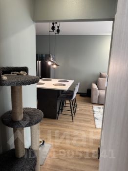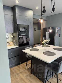 Кухня встроенная, посудомойка, вытяжка, микроволновка, духовой шкаф, подсветка, остров с каменной столешницей в качестве обеденной зоны.