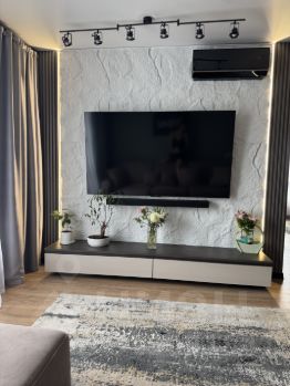 Просторная кухня-гостиная, дизайнерская ТВ зона под камень с подсветкой и подвесной тумбой, много свободного места.