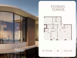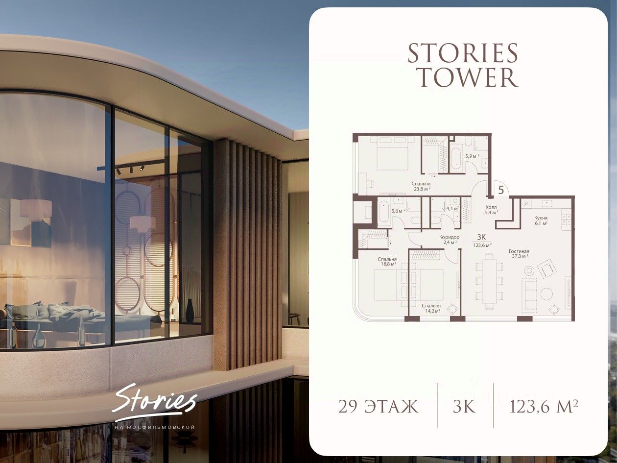 Старт продаж просторного пентхауса с тремя спальнями на 123,6 м² на 29 этаже Stories Tower на Мосфильмовской.