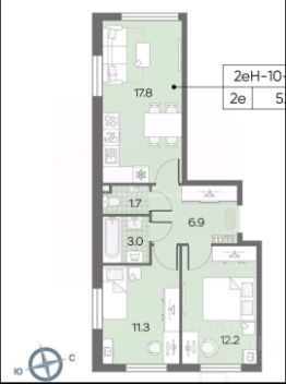 Современная и функциональная планировка - общая кухня-гостиная и две спальни.
