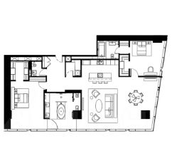 Общая площадь апартамента по документам 156,4 кв.м. Планировка представляет собой: просторный холл; кухня-гостиная, 2 мастер спальни, 3 санузла.