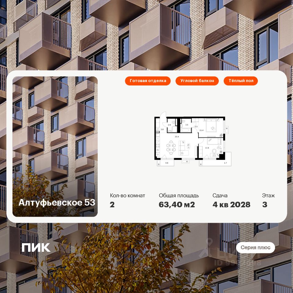 Продаётся 2-комн. квартира площадью 63,4 кв.м на 3 этаже 22 этажного дома (Корпус 1.1, Секция 1) проекта ПИК Алтуфьевское 53. Светлый просторный подъезд на уровне земли, функциональная планировка, большие окна, c отделкой.