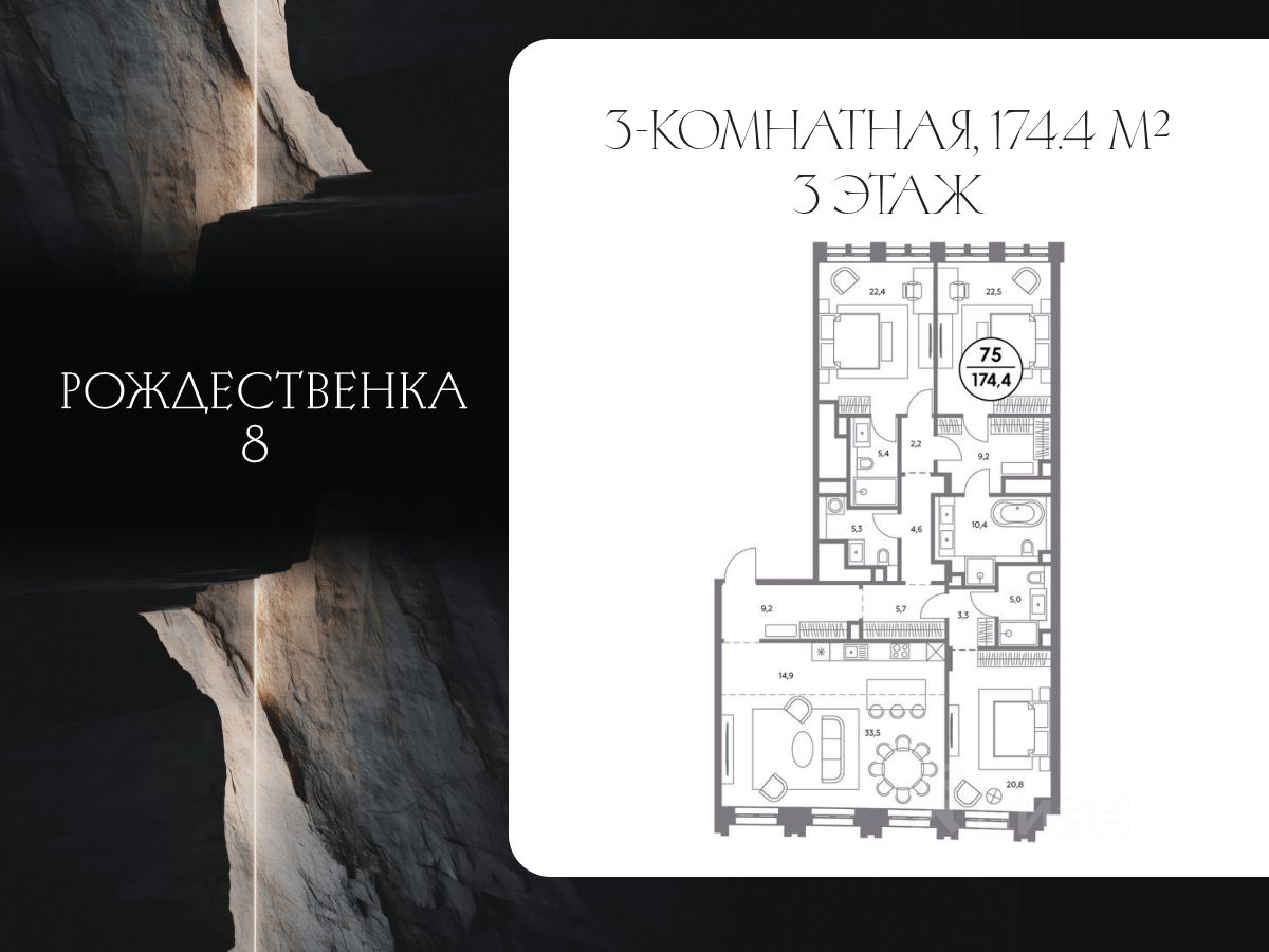 В продаже 3 комнатная квартира площадью 174.40 кв. м, расположенная на 3 этаже 7 этажного дома. Квартира находится в 1 корпусе жилых домов делюкс-класса "Рождественка 8".