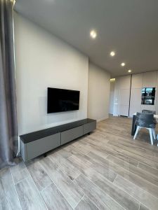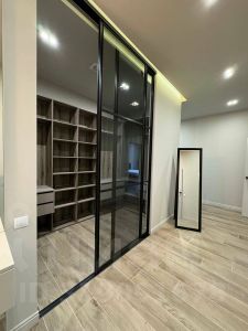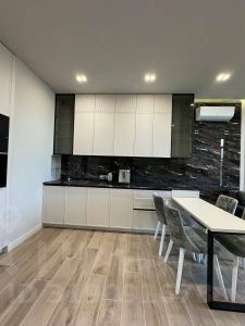 Интерьер оформлен в современном стиле. Использованы качественные материалы, бытовая техника и сантехника — от надёжных брендов. Кондиционеры Daikin с дистанционным управлением, окна с алюминиевым профилем.
