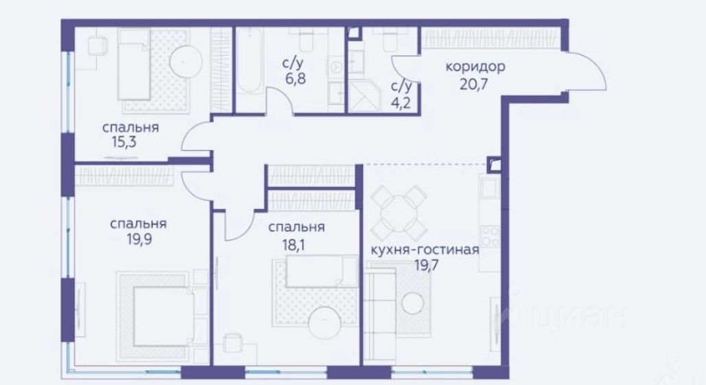 Удобная и удачная планировка готова впитать все ваши пожелания, планы и реализовать при ремонте, будь то 2-х,3-х,4-х комнатная квартира + большая кухня-гостиная . Также по плану 2 сан.узла . ЖК полностью с развитой инфраструктурой ( школы, дет.сады, магазины,