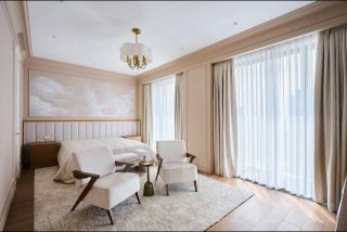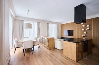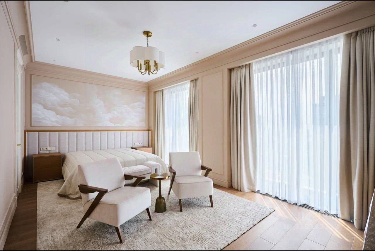 Для отделки использованы исключительно высококачественные материалы мирового уровня: полы в жилых зонах покрыты инженерной доской, ванных комнатах — премиальным итальянским керамогранитом, а прихожая украшена итальянской плиткой. Стены декорированы уникальными ручными обоями ведущих европейских брендов Fresq, GEO.44, Arte, потолки представляют собой изящные подвесные конструкции с лепниной ручной работы.