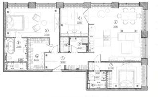 Интерьер в санузлах дополняют предметы сантехники от известных производителей Villeroy & Boch (Германия), Giulnig (Италия), Tres (Испания). Вся корпусная мебель, шкафы, стеновые панели и двери изготовлены индивидуально под заказ специально для данной квартиры. Для поддержания идеального микроклимата установлен современный климатический комплекс с фанкойлами производства японской компании DAIKON.