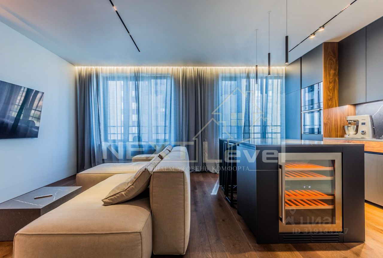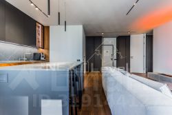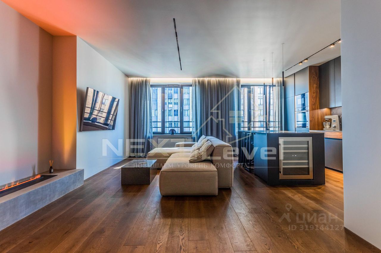 В апартаментах большая кухня-гостиная с электрическим камином, инженерной доской, встроенной кухней фабрики Hamiltoun со всей бытовой техникой премиум класса Neff и Liebherr, столешница и стеновая панель из искусственного камня, две морозильные камеры и встроенный холодильник, винный шкаф, диван итальянской фабрики из дорогой ткани с ортопедическим наполнением, современные подоконники из суперпрочной декоративной заливки, на потолке встраиваемые трековые светильники.