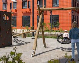 В проекте предусмотрена медленная зона для электросамокатов — с 7 утра до полуночи при въезде на территорию квартала скорость электросамокатов автоматически снижается до 15 км/ч. Артикул 976415 (Застройщик АО "Специализированный застройщик "Волжский парк"")