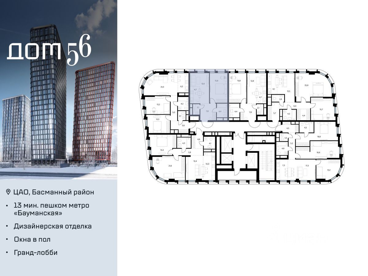В премиум-квартале "Дом 56" на Бауманской напрямую от девелопера ГК "Галс-Девелопмент" представлена 1-комнатная квартира на 19 этаже общей площадью 47.40 м².