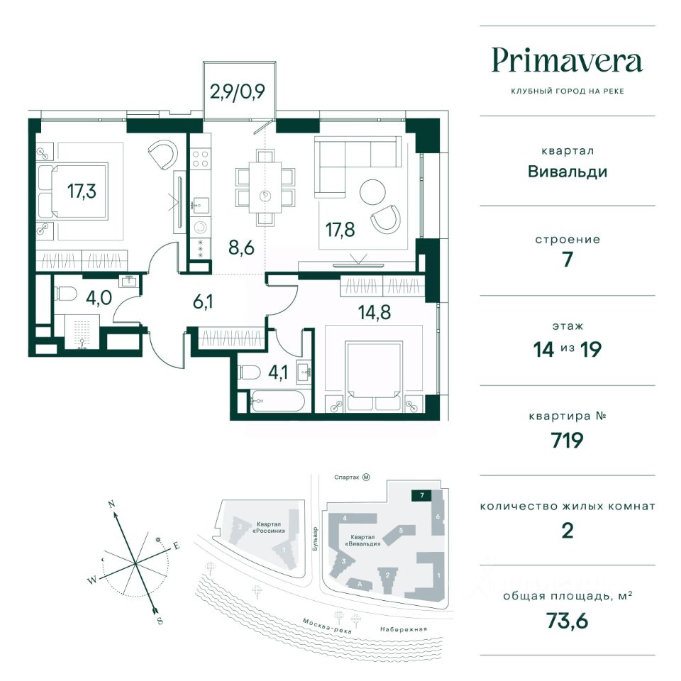Клубный город на реке Primavera — это современный жилой комплекс премиум-класса, расположенный на первой береговой линии Москвы-реки в экологически чистом районе Покровское-Стрешнево. Под панорамными окнами квартир находится собственный экопарк с продуманной сетью прогулочных дорожек и современными детскими и спортивными площадками. За парком расположена набережная с собственным пляжем и зонами для отдыха. Клубный город на реке Primavera предлагает широкий выбор планировок для различных жизненных сценариев: от просторных однокомнатных квартир до пентхаусов и жилых помещений с террасами и патио. Выберите из 120 вариантов эргономичных планировок стандартного и евроформата. Из каждой квартиры открываются красивые виды на реку с углом обзора в 270 градусов. Дизайнерские лобби предлагают панорамный обзор на благоустроенный двор. Высокие потолки в 6 метров и качественная отделка создают атмосферу, схожую с пятизвездочными отелями. В Primavera есть всё необходимое для комфортной жизни в мегаполисе: • Образование для детей в шаговой доступности: 4 школы, 8 детских садов и развивающие центры с кружками и секциями. • Удобства на расстоянии приятной прогулки: супермаркеты, кафе, рестораны с верандами, салоны красоты, аптеки и многофункциональный центр для шоппинга и развлечений. • Умный дом: автоматизированное бесконтактное управление основными системами доступа и безопасности через мобильное приложение. Клубный город на реке Primavera выгодно сочетает комфорт городской жизни с близостью к природе. Живите в месте, где все создано для вашего удобства!