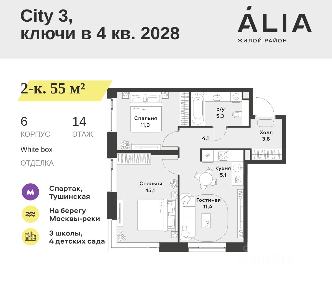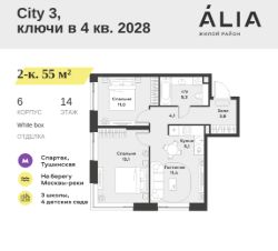 Продаётся 2-комнатная квартира 55 м². В жилом районе ALIA на 14-м этаже 28-этажного дома.