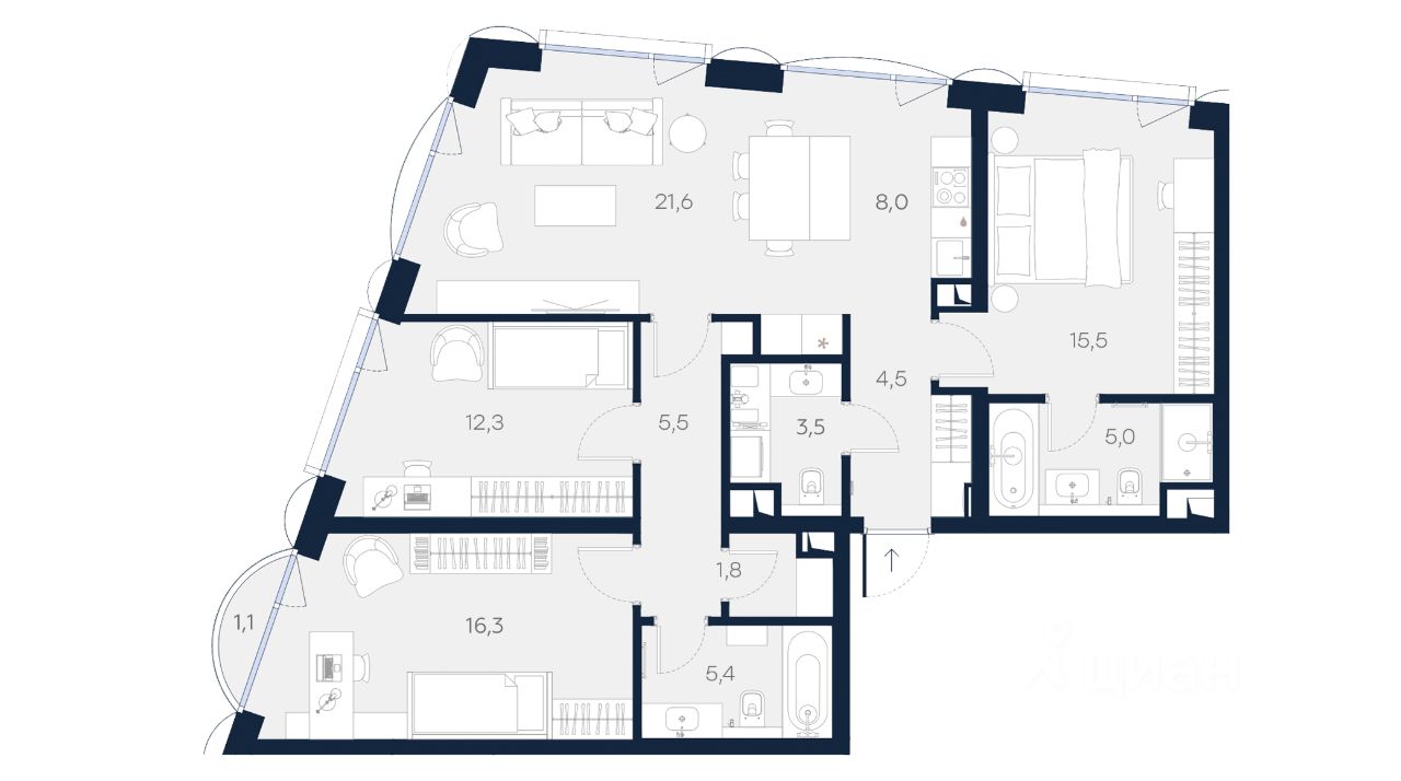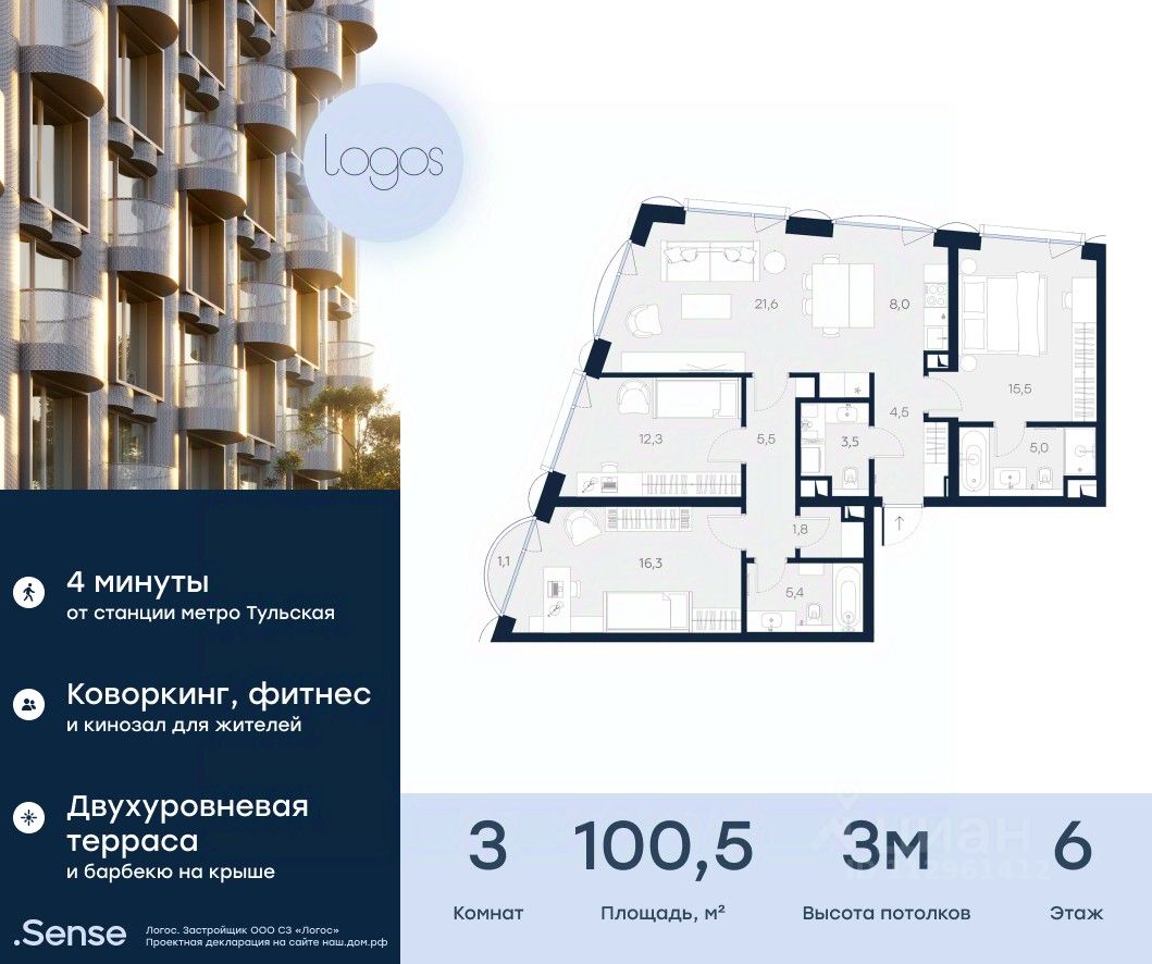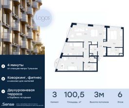 Последний апартамент с тремя спальнями в клубном доме Logos площадью 100,5 м² расположен на 6 этаже. Потолки 3,1 м, функциональное зонирование: три изолированные спальни, три санузла, постирочная и балкон в одной из спален, а также просторная кухня-гостиная с островом и рабочей поверхностью у окна, с тремя панорамными окнами "Schuco" в пол и видом на ухоженный сквер Серпуховской заставы с фонтаном, а также на тихую улицу с односторонним движением и исторические казармы Императорского полка XIX века. Отделка White box. Logos — готовый дом премиум-класса для единомышленников, где каждый находит баланс между активной жизнью и уединением. Для резидентов — 1500 м² общественных пространств: открытая терраса на крыше, фитнес-зал, кинозал, сауна, коворкинг, гостиная с дровяным камином. Подземный паркинг с зарядными станциями для электромобилей, велопарковка, прачечная и келлеры.