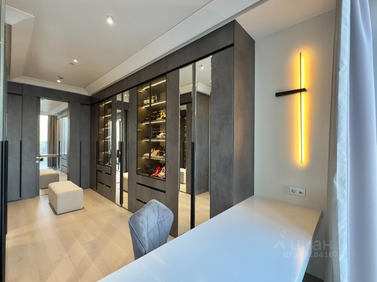 Кабинет/гардеробная: зона гардеробной - 13 м², с продуманными системами хранения, зона кабинета - 7,8 м² с рабочим столом напротив окна;