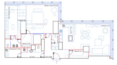Функциональная планировка: холл, гостиная с кухонной зоной, мастер спальня, два санузла, гардеробные и кладовая с постирочной.
