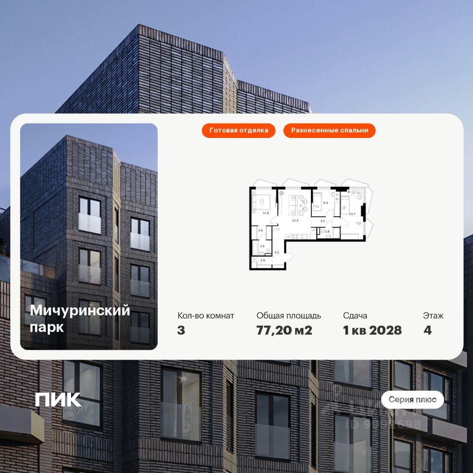 Продаётся 3-комн. квартира площадью 77,2 кв.м на 4 этаже 24 этажного дома (Корпус 4.2, Секция 1) проекта ПИК Мичуринский парк. Светлый просторный подъезд на уровне земли, функциональная планировка, большие окна, c отделкой.