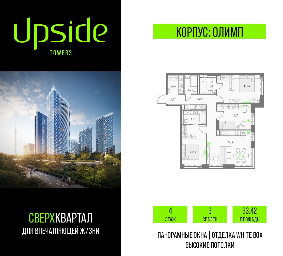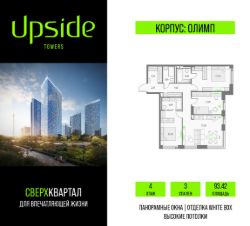 Продаётся 3-комнатная квартира площадью 93.42 кв.м на 4 этаже 19 этажного корпуса Олимп в квартале небоскребов "Апсайд Тауэрс", в квартире предчистовая отделка, c видом на корпус Монте Бьянко, корпус Эверест, внутренний двор, ландшафтный парк. Номер квартиры В0407.