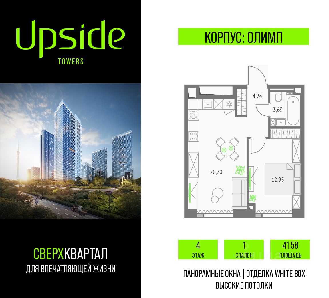 Продаётся 1-комнатная квартира площадью 41.58 кв.м на 4 этаже 19 этажного корпуса Олимп в квартале небоскребов "Апсайд Тауэрс", в квартире предчистовая отделка, c видом на внутренний двор, ландшафтный парк. Номер квартиры В0410.