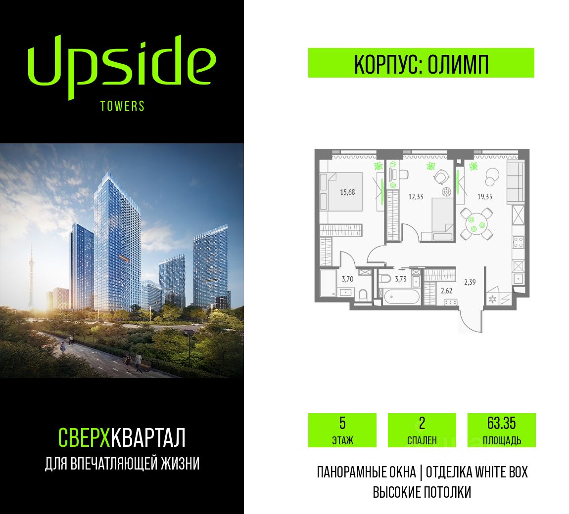 Продаётся 2-комнатная квартира площадью 63.35 кв.м на 5 этаже 19 этажного корпуса Олимп в квартале небоскребов "Upside Towers". В квартире отделка White-box, c видом на корпус Эльбрус, Бизнес-парк Останкино, прогулочный бульвар, детский сад, школу. Номер квартиры В0504.