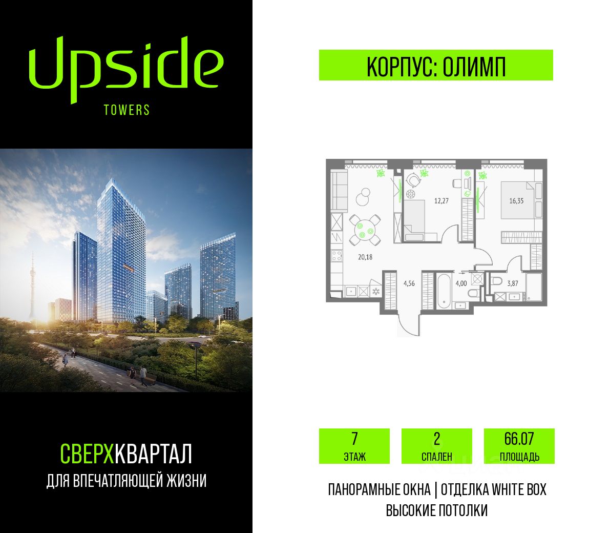 Продаётся 2-комнатная квартира площадью 66.07 кв.м на 7 этаже 19 этажного корпуса Олимп в квартале небоскребов "Upside Towers". В квартире отделка White-box, c видом на корпус Эльбрус, Бизнес-парк Останкино, прогулочный бульвар, детский сад, школу, Останкинскую башню. Номер квартиры В0705.