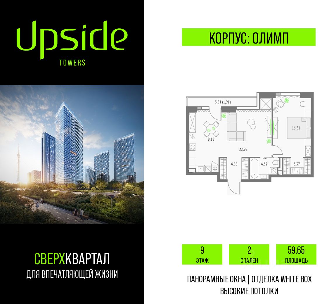Продаётся 2-комнатная квартира площадью 59.65 кв.м на 9 этаже 19 этажного корпуса Олимп в квартале небоскребов "Upside Towers". В квартире отделка White-box, c видом на корпус Эльбрус, Бизнес-парк Останкино, прогулочный бульвар, детский сад, школу, Останкинскую башню. Номер квартиры В0905.