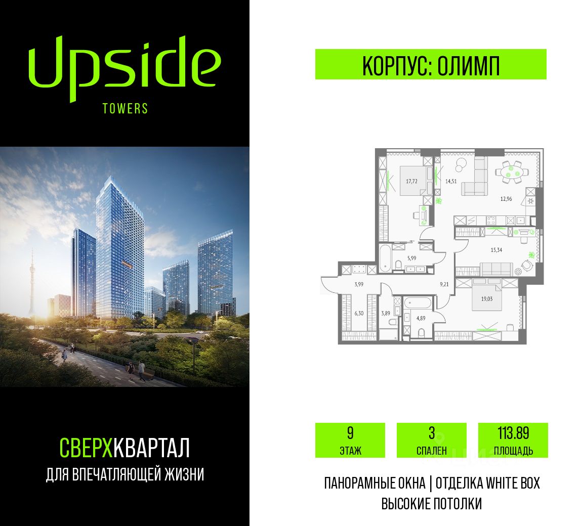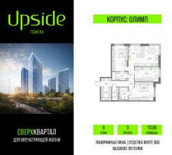 Продаётся 3-комнатная квартира площадью 113.89 кв.м на 9 этаже 19 этажного корпуса Олимп в квартале небоскребов "Upside Towers". В квартире отделка White-box, c видом на Бизнес-парк Останкино, прогулочный бульвар, детский сад, школу, корпус Монте Бьянко. Номер квартиры В0906.