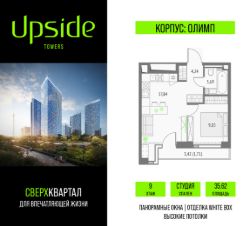 Продаётся студия площадью 35.62 кв.м на 9 этаже 19 этажного корпуса Олимп в квартале небоскребов "Upside Towers". В квартире отделка White-box, c видом на внутренний двор, ландшафтный парк. Номер квартиры В0910.