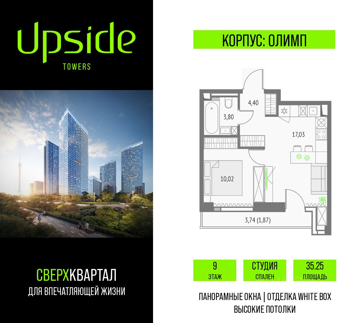 Продаётся студия площадью 35.25 кв.м на 10 этаже 19 этажного корпуса Олимп в квартале небоскребов "Upside Towers". В квартире отделка White-box, c видом на внутренний двор, ландшафтный парк. Номер квартиры В1009.