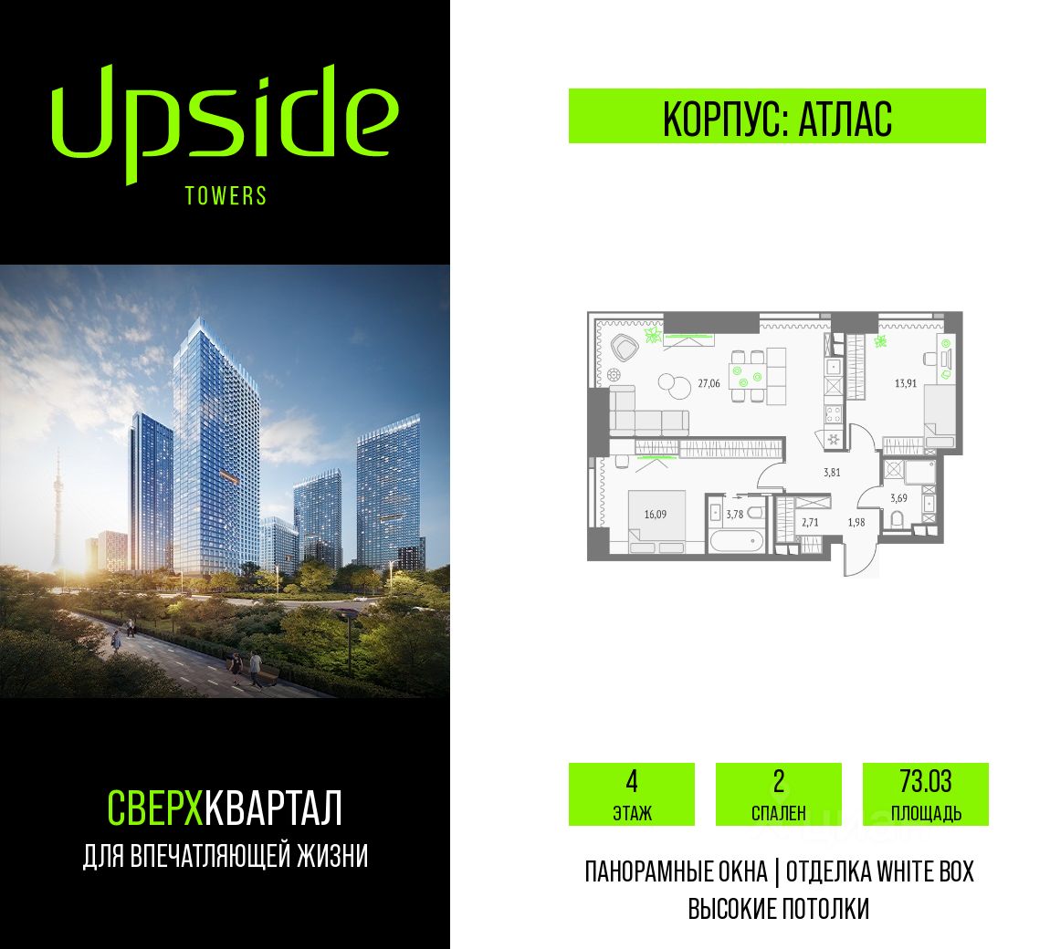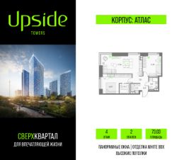 Продаётся 2-комнатная квартира площадью 73.03 кв.м на 4 этаже 47 этажного корпуса Атлас в квартале небоскребов "Upside Towers". В квартире отделка White-box, c видом на корпус Эльбрус, прогулочный бульвар, Савеловский сити, Гончаровский парк. Номер квартиры Б0402.
