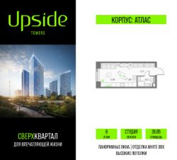Продаётся студия площадью 26.85 кв.м на 6 этаже 47 этажного корпуса Атлас в квартале небоскребов "Upside Towers". В квартире отделка White-box, c видом на Савеловский сити, Гончаровский парк. Номер квартиры Б0601.