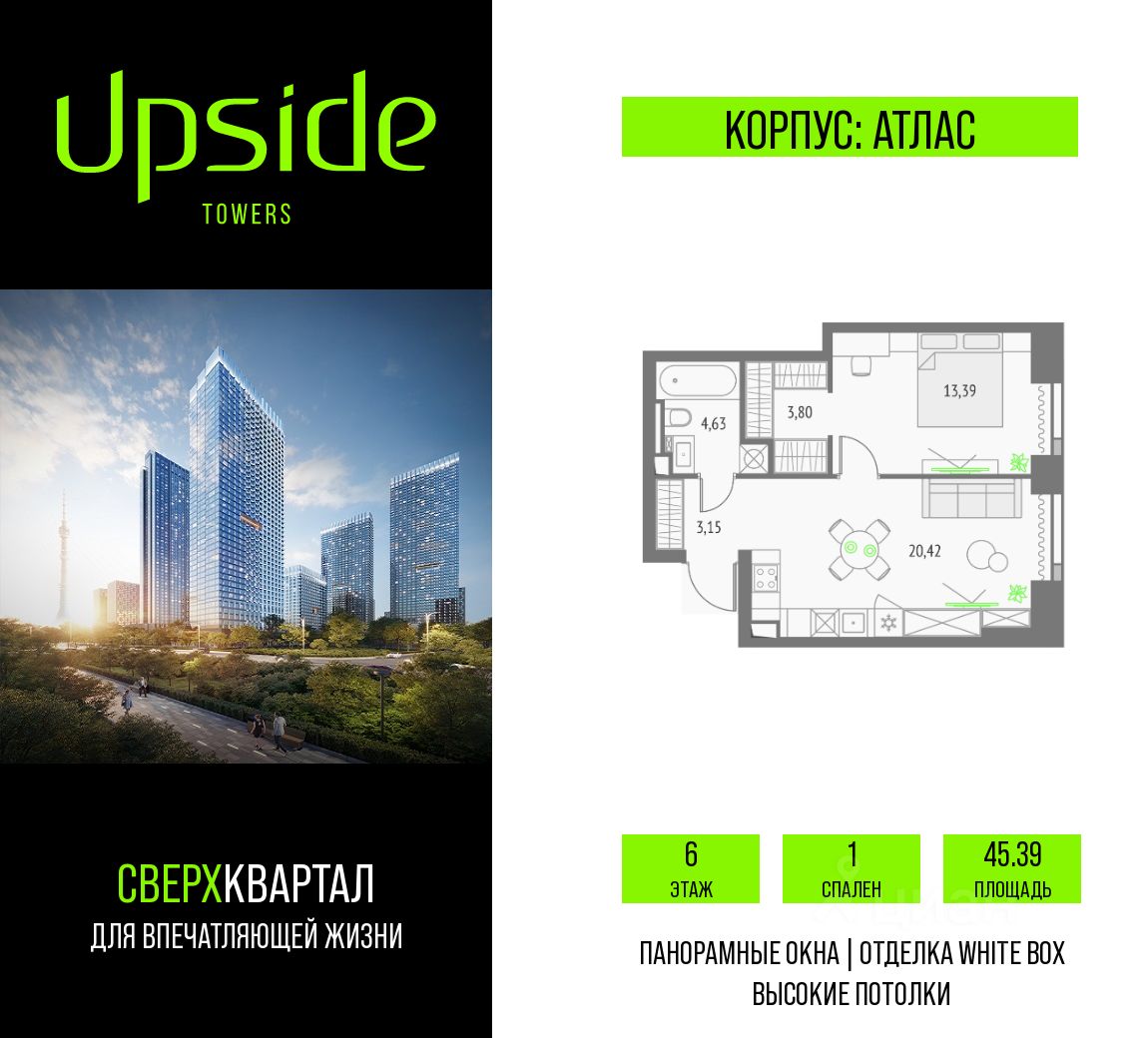 Продаётся 1-комнатная квартира площадью 45.39 кв.м на 6 этаже 47 этажного корпуса Атлас в квартале небоскребов "Upside Towers". В квартире отделка White-box, c видом на корпус Олимп, внутренний двор. Номер квартиры Б0608.