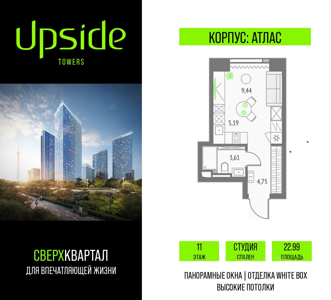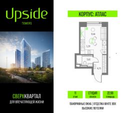 Продаётся студия площадью 22.99 кв.м на 11 этаже 47 этажного корпуса Атлас в квартале небоскребов "Upside Towers". В квартире отделка White-box, c видом на корпус Эльбрус, прогулочный бульвар. Номер квартиры Б1103.