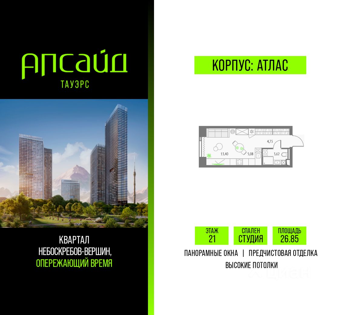 Продаётся студия площадью 26.85 кв.м на 21 этаже 47 этажного корпуса Атлас в квартале небоскребов "Апсайд Тауэрс". В квартире предчистовая отделка, с видом на Савеловский сити, Гончаровский парк, Москва-Сити, центр. Номер квартиры Б2101.