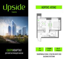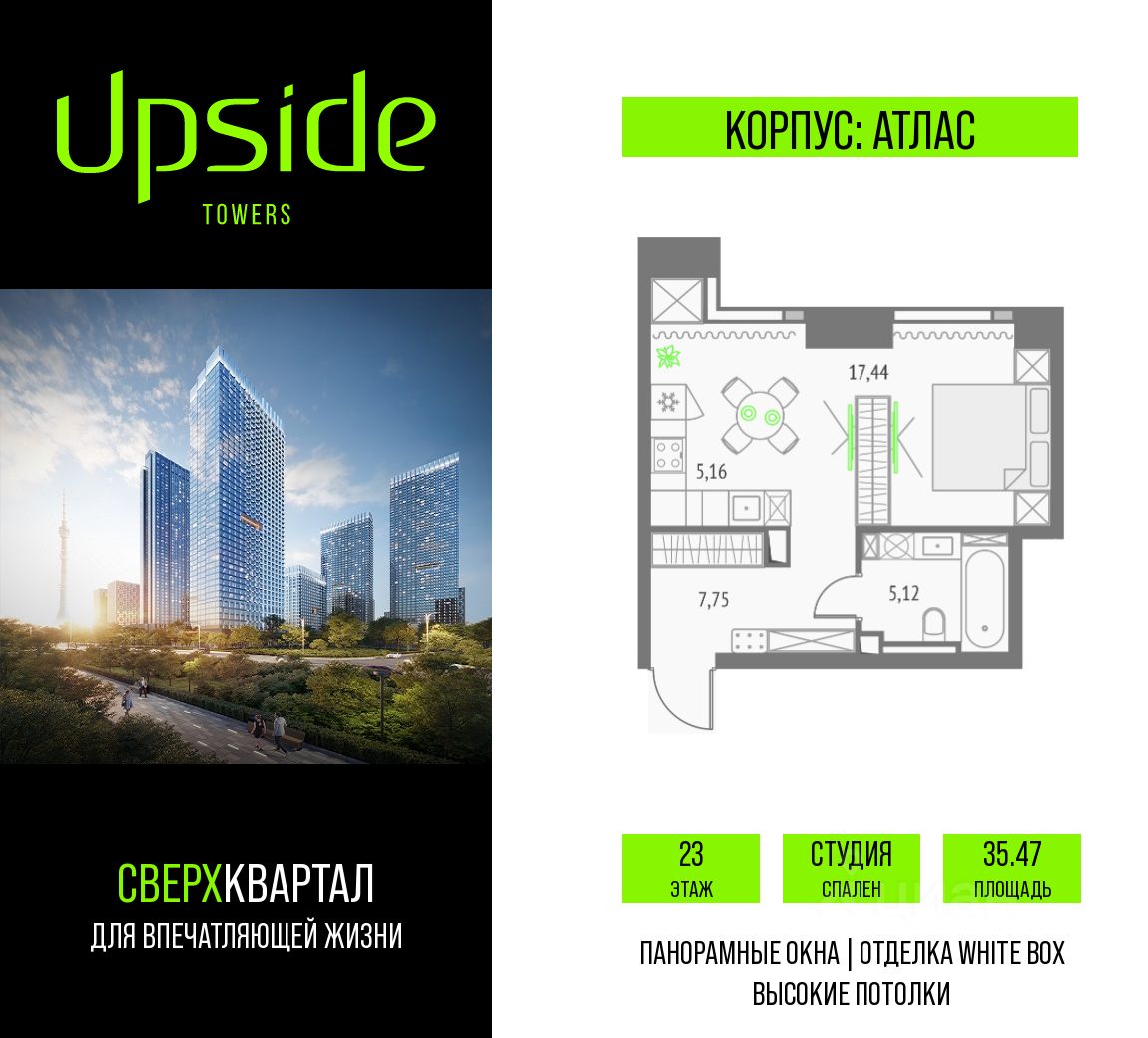 Продаётся студия площадью 35.47 кв.м на 23 этаже 47 этажного корпуса Атлас в квартале небоскребов "Upside Towers". В квартире отделка White-box, c видом на корпус Эльбрус, прогулочный бульвар. Номер квартиры Б2304.