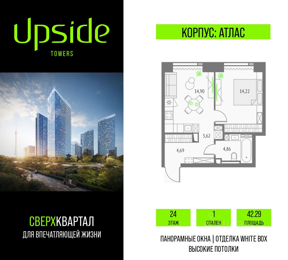 Продаётся 1-комнатная квартира площадью 42.29 кв.м на 24 этаже 47 этажного корпуса Атлас в квартале небоскребов "Upside Towers". В квартире отделка White-box, c видом на корпус Эльбрус, прогулочный бульвар. Номер квартиры Б2404.
