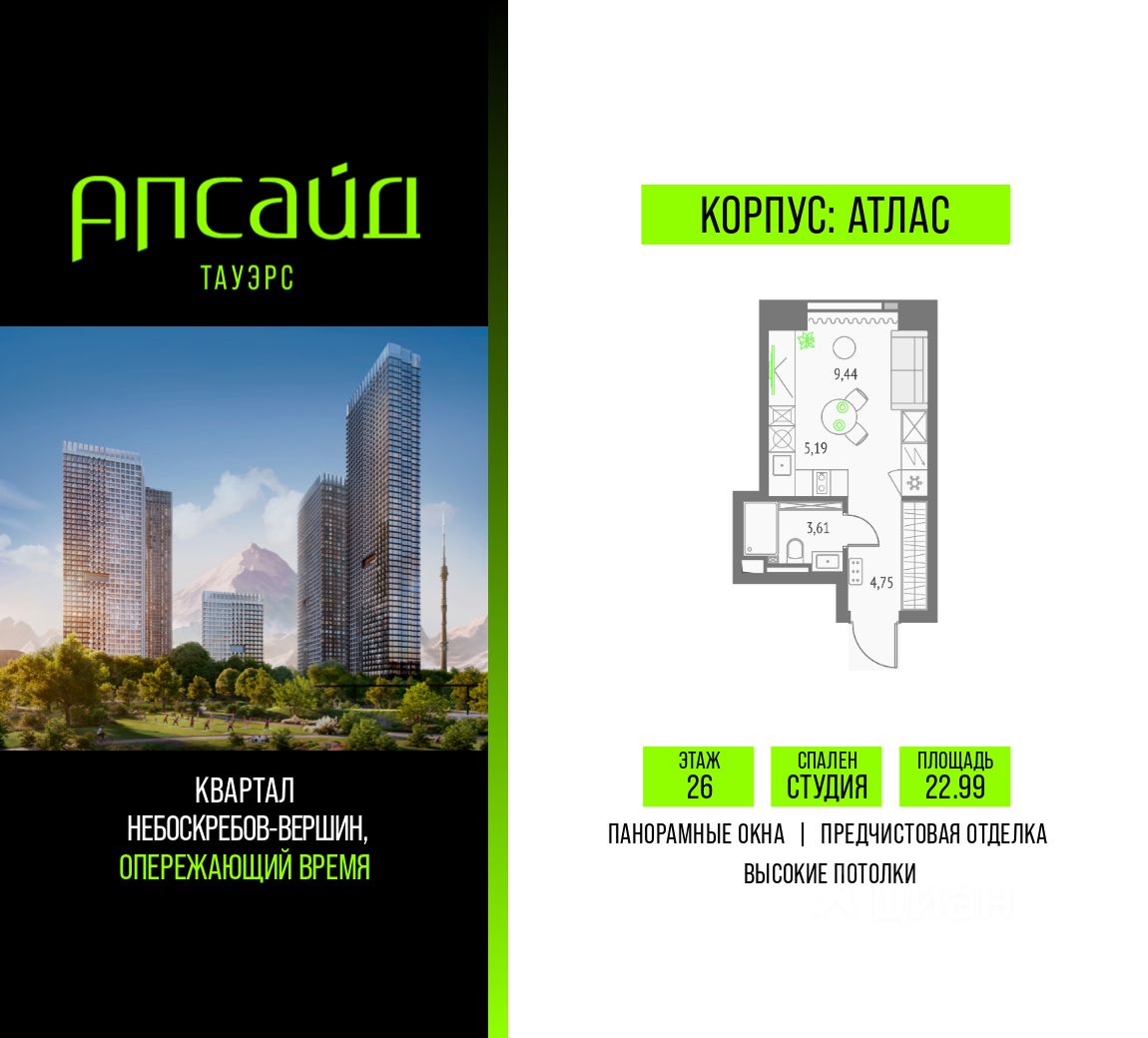 Продаётся студия площадью 22.99 кв.м на 26 этаже 47 этажного корпуса Атлас в квартале небоскребов "Апсайд Тауэрс". В квартире предчистовая отделка, с видом на корпус Эльбрус, прогулочный бульвар. Номер квартиры Б2603.