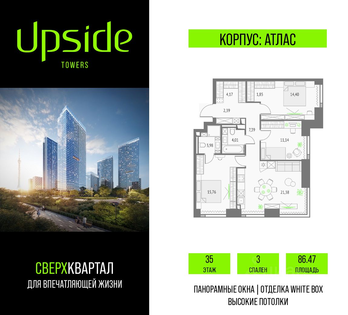 Продаётся 3-комнатная квартира площадью 86.47 кв.м на 35 этаже 47 этажного корпуса Атлас в квартале небоскребов "Upside Towers". В квартире отделка White-box, c видом на корпус Монте Бьянко, корпус Эверест, внутренний двор, ландшафтный парк, Парк Сокольники, Останкинскую Башню. Номер квартиры Б3508.