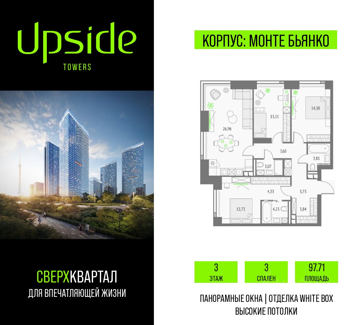 Продаётся 3-комнатная квартира площадью 97.71 кв.м на 3 этаже 46 этажного корпуса Монте Бьянко в квартале небоскребов "Upside Towers". В квартире отделка White-box, c видом на Бизнес-парк Останкино, прогулочный бульвар, детский сад, школу, Останкинскую Башню. Номер квартиры Г0301.