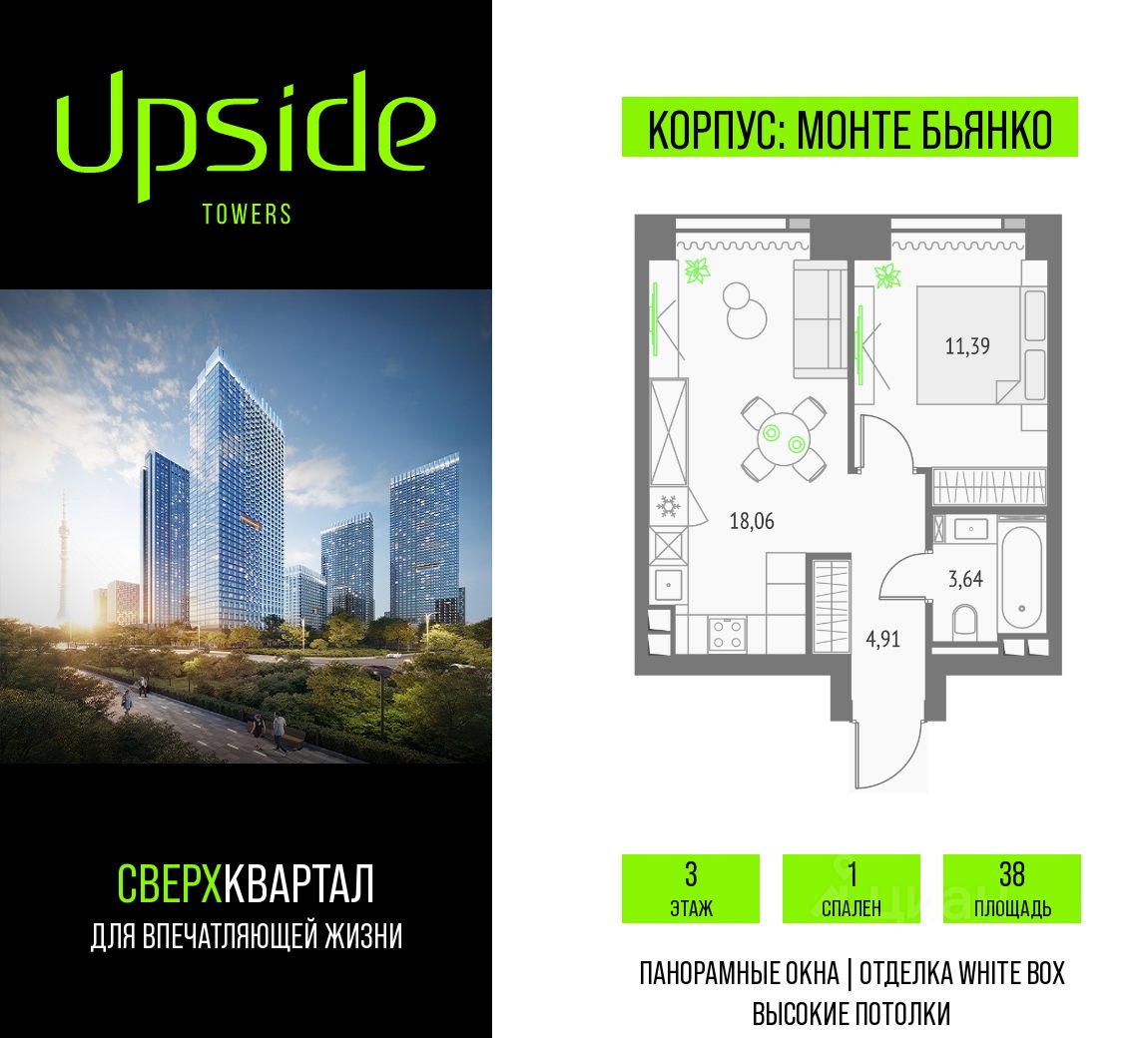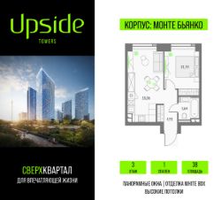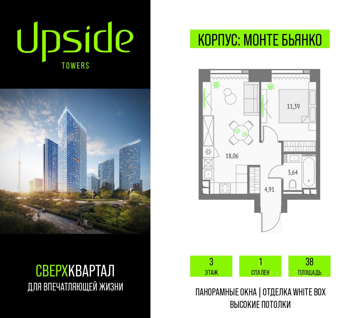 Продаётся 1-комнатная квартира площадью 38 кв.м на 3 этаже 46 этажного корпуса Монте Бьянко в квартале небоскребов "Upside Towers". В квартире отделка White-box, c видом на Звездный бульвар, Ольгинский храм, Останкинскую Башню. Номер квартиры Г0305.