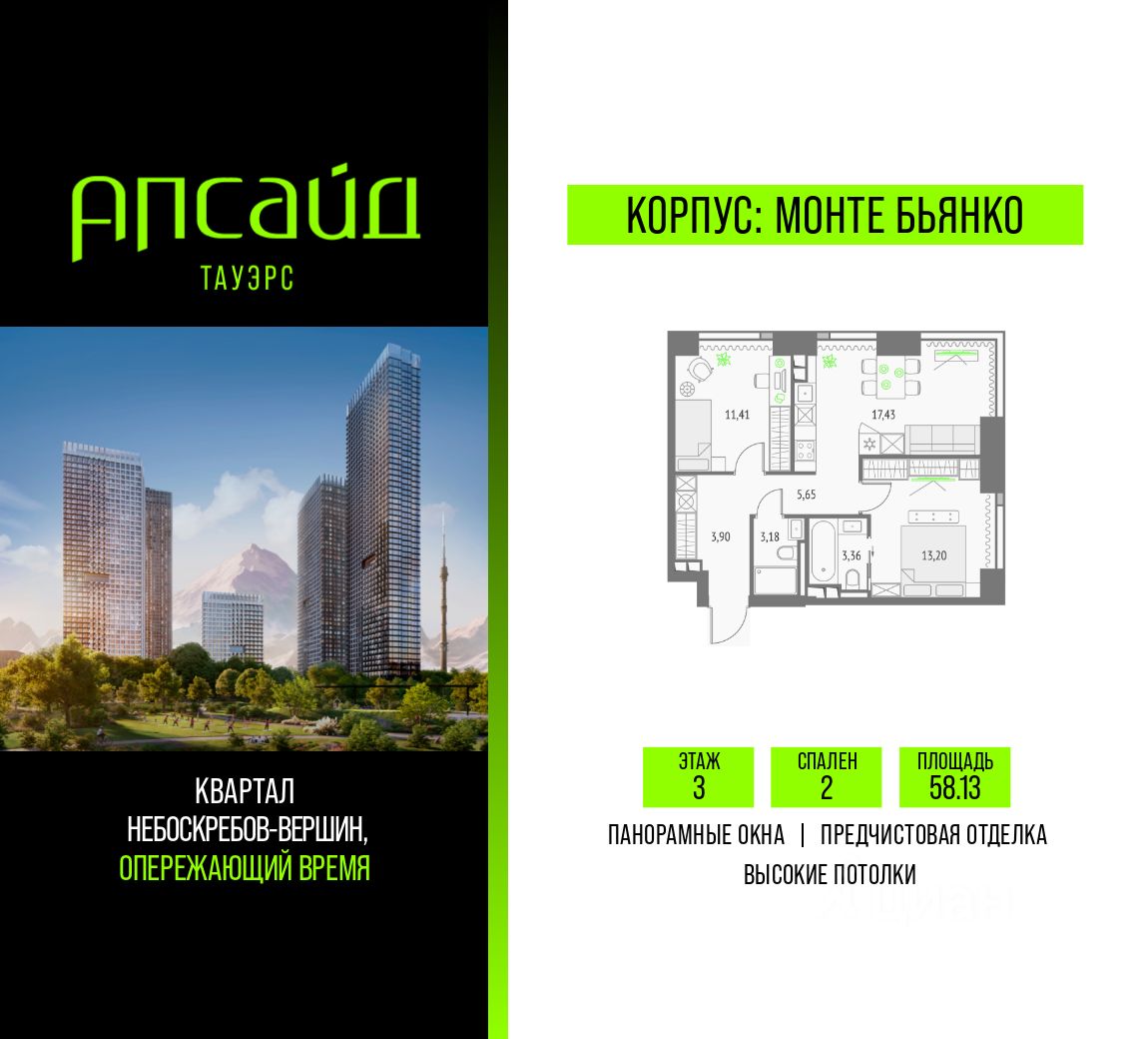 Продаётся 2-комнатная квартира площадью 58.13 кв.м на 3 этаже 46 этажного корпуса Монте Бьянко в квартале небоскребов "Апсайд Тауэрс". В квартире предчистовая отделка,с видом на Звездный бульвар, Ольгинский храм, корпус Эверест. Номер квартиры Г0306.