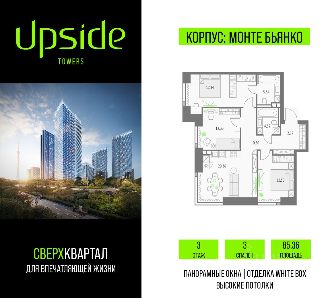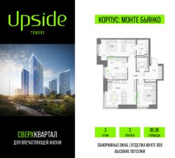 Продаётся 3-комнатная квартира площадью 85.36 кв.м на 3 этаже 46 этажного корпуса Монте Бьянко в квартале небоскребов "Upside Towers". В квартире отделка White-box, c видом на Корпус Олимп, корпус Эльбрус, Бизнес-парк Останкино, прогулочный бульвар, детский сад, школу. Номер квартиры Г0313.