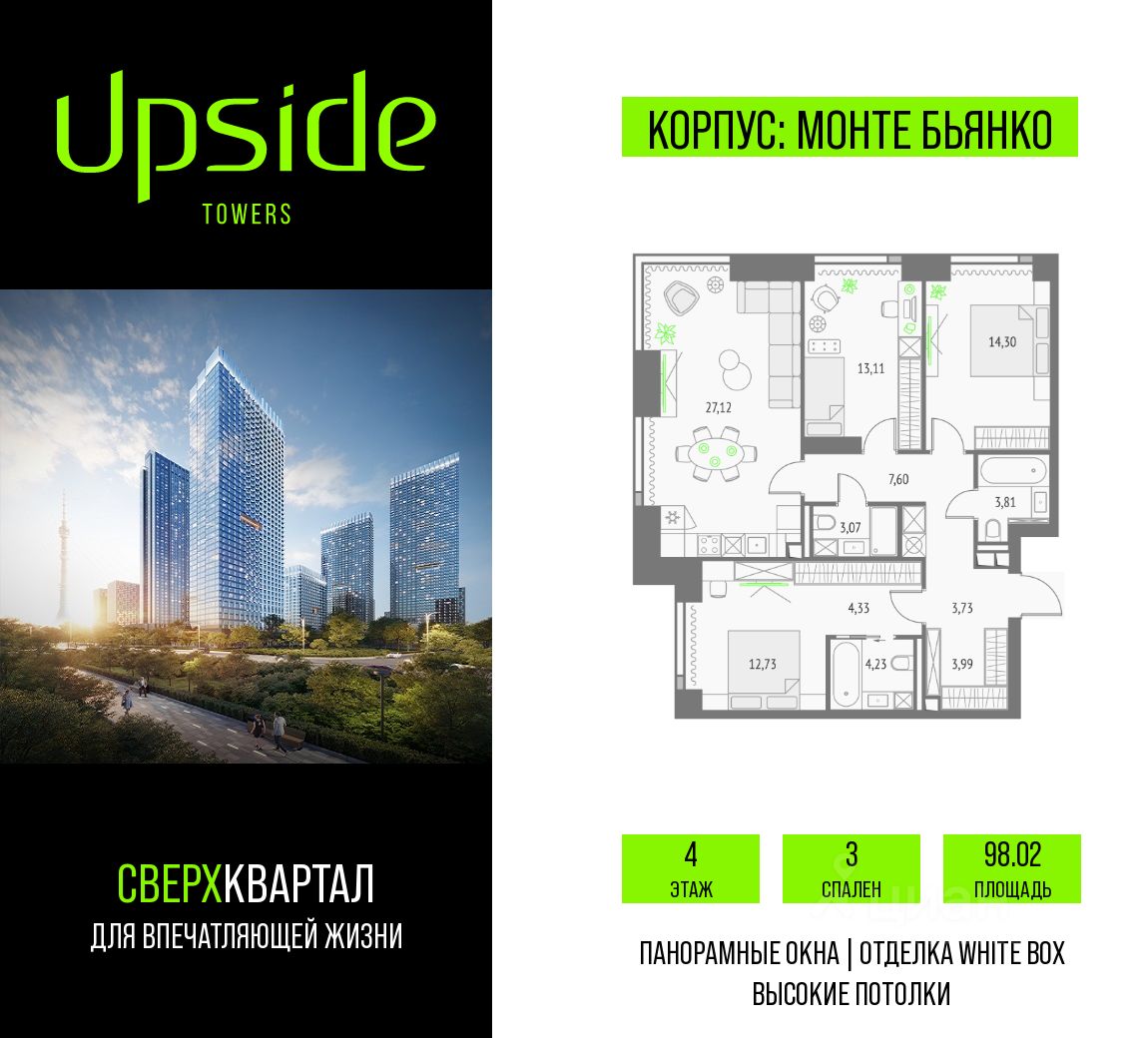 Продаётся 3-комнатная квартира площадью 98.02 кв.м на 4 этаже 46 этажного корпуса Монте Бьянко в квартале небоскребов "Апсайд Тауэрс", в квартире предчистовая отделка, c видом на Бизнес-парк Останкино, прогулочный бульвар, детский сад, школу, Останкинскую Башню. Номер квартиры Г0401.