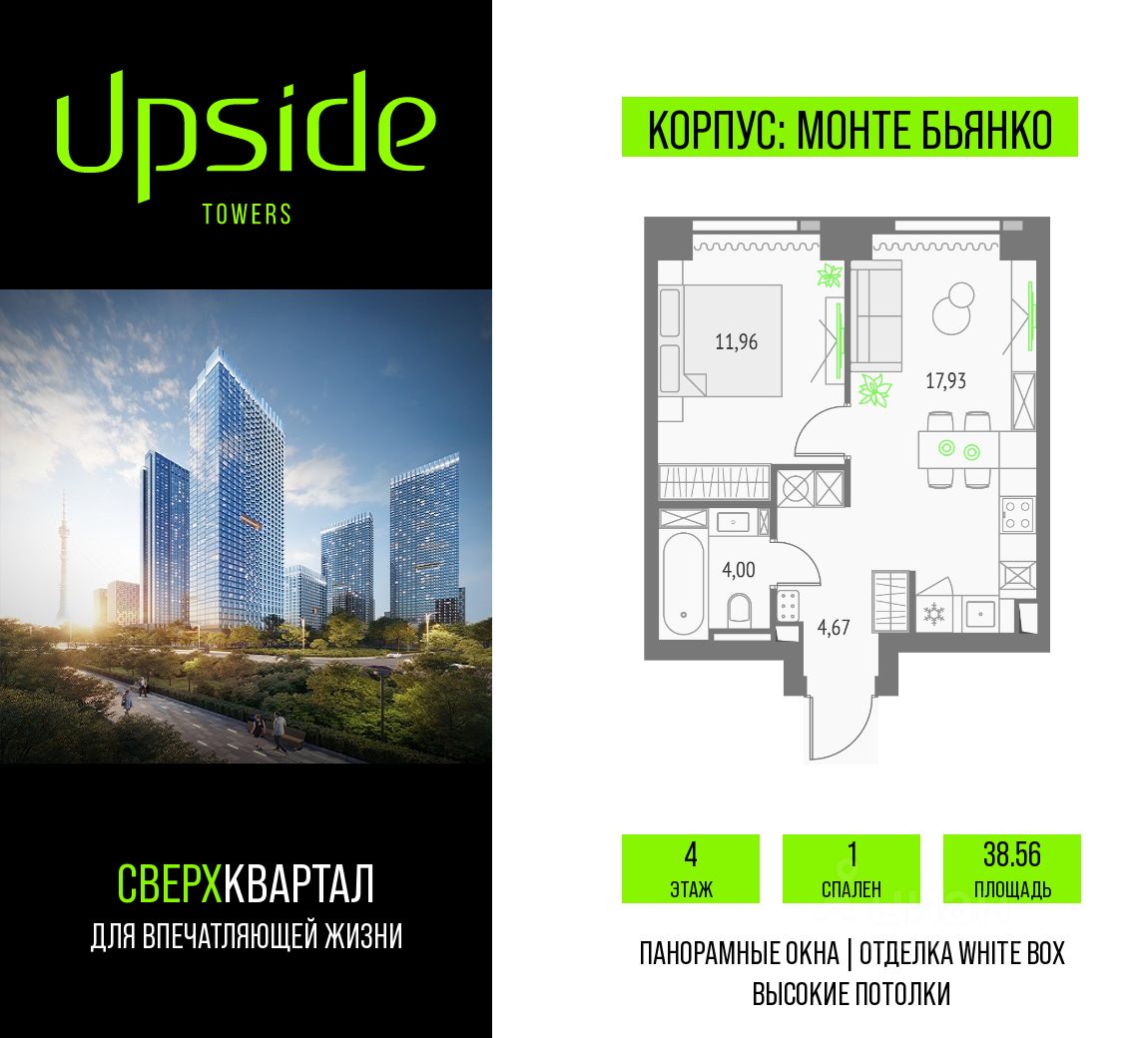 Продаётся 1-комнатная квартира площадью 38.56 кв.м на 4 этаже 46 этажного корпуса Монте Бьянко в квартале небоскребов "Upside Towers". В квартире отделка White-box, c видом на Звездный бульвар, Ольгинский храм, Останкинскую Башню. Номер квартиры Г0402.