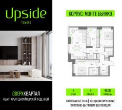 Продаётся 3-комнатная квартира площадью 98.28 кв.м на 7 этаже 46 этажного корпуса Монте Бьянко в квартале небоскребов "Upside Towers". Квартира с чистовой отделкой, c видом на Бизнес-парк Останкино, прогулочный бульвар, детский сад, школу, Останкинскую Башню. Номер квартиры Г0701.