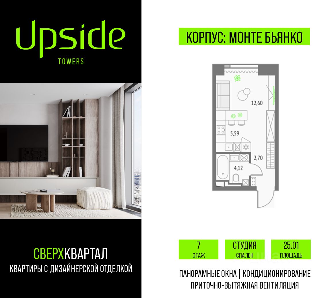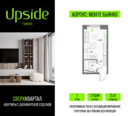 Продаётся студия площадью 25.01 кв.м на 7 этаже 46 этажного корпуса Монте Бьянко в квартале небоскребов "Апсайд Тауэрс", квартира с чистовой отделкой, c видом на Звездный бульвар, Ольгинский храм, Останкинскую Башню. Номер квартиры Г0704.
